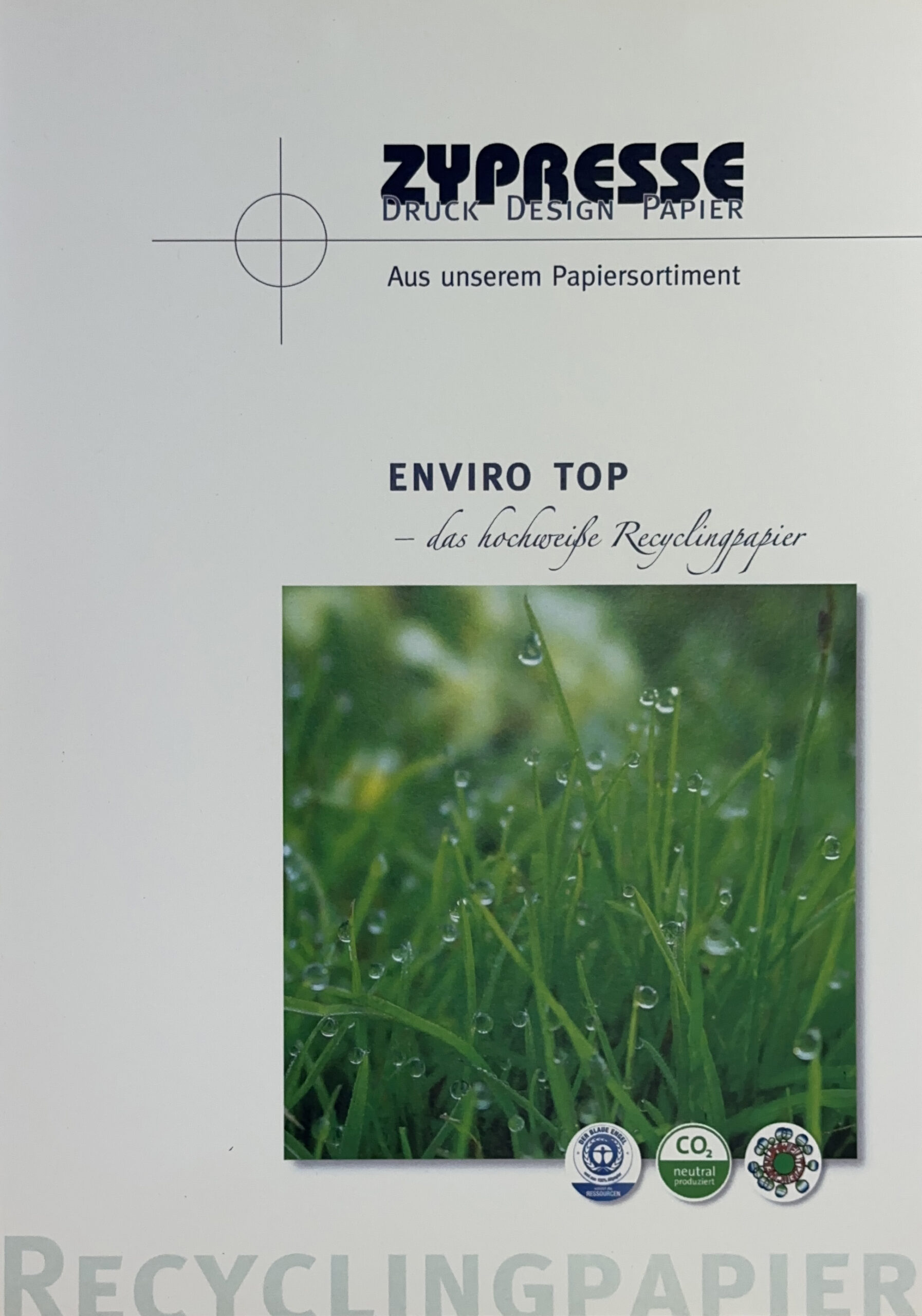 Enviro Top ist ein weißes Recyclingpapier. Durch das 1,3-fache Volumen ist die Oberfläche weich und samtig. Bei Abbildungen überzeugt es durch seine gute Kontrastwirkung. Das für Enviro Top eingesetzte Altpapier wird nach modernsten De-Inking-Verfahren aufbereitet.